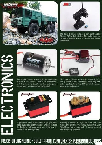 The Beast II Chassis features the popular RC4WD Outcry Brushed Speed Controller with built-in drag brake and a separate 6V 5amp Turbo BEC for reliable, constant power on demand. Anytime.
