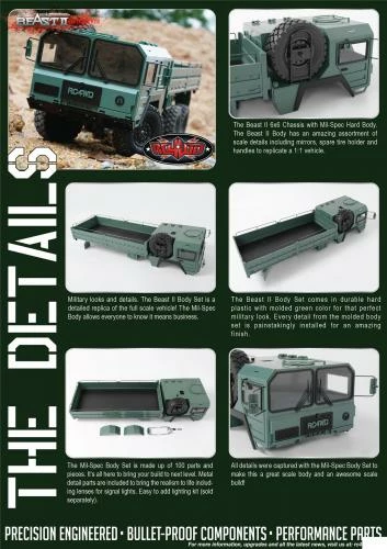 Military looks and details. The Beast II Body Set is a detailed replica of the full scale vehicle! The Mil-Spec Body allows everyone to know it means business.